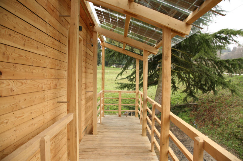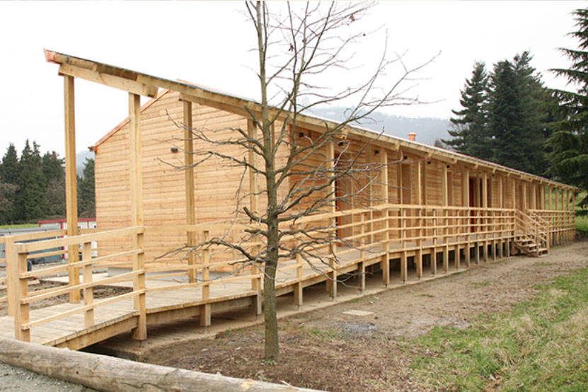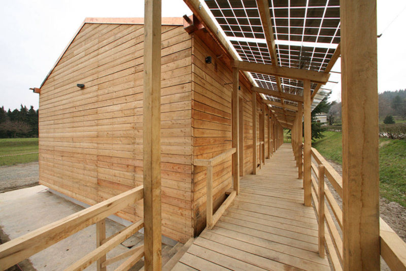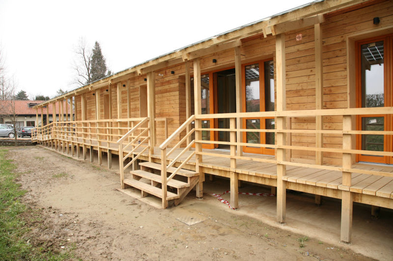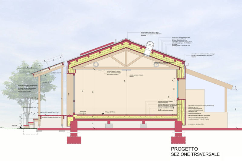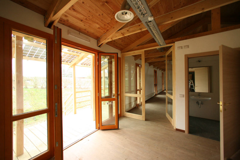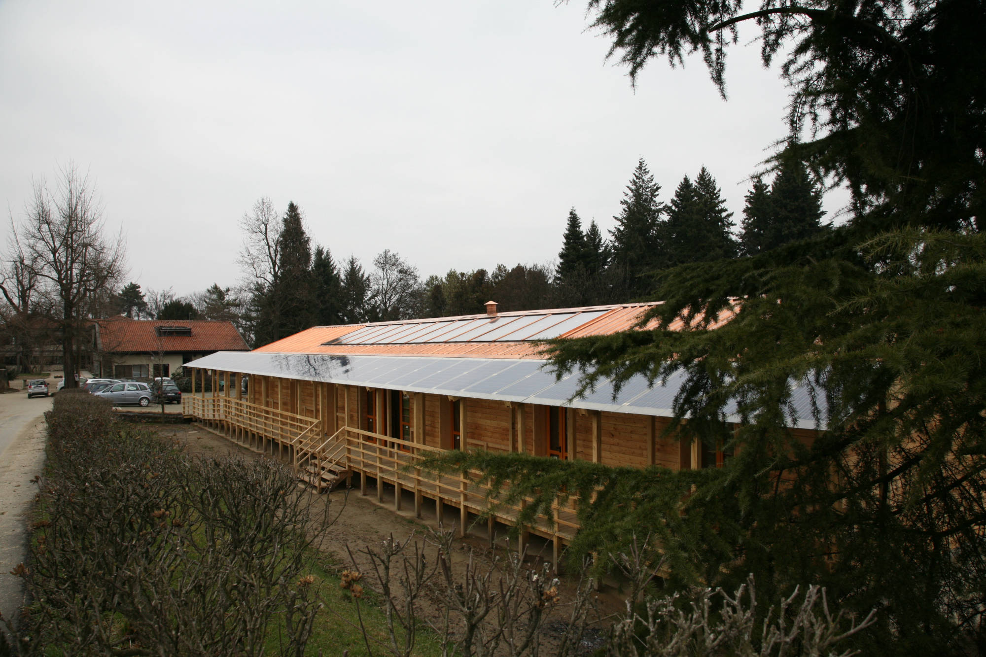 L’edificio a struttura lignea, con tamponamenti in legno, è isolato a cappotto con pannelli in fibra