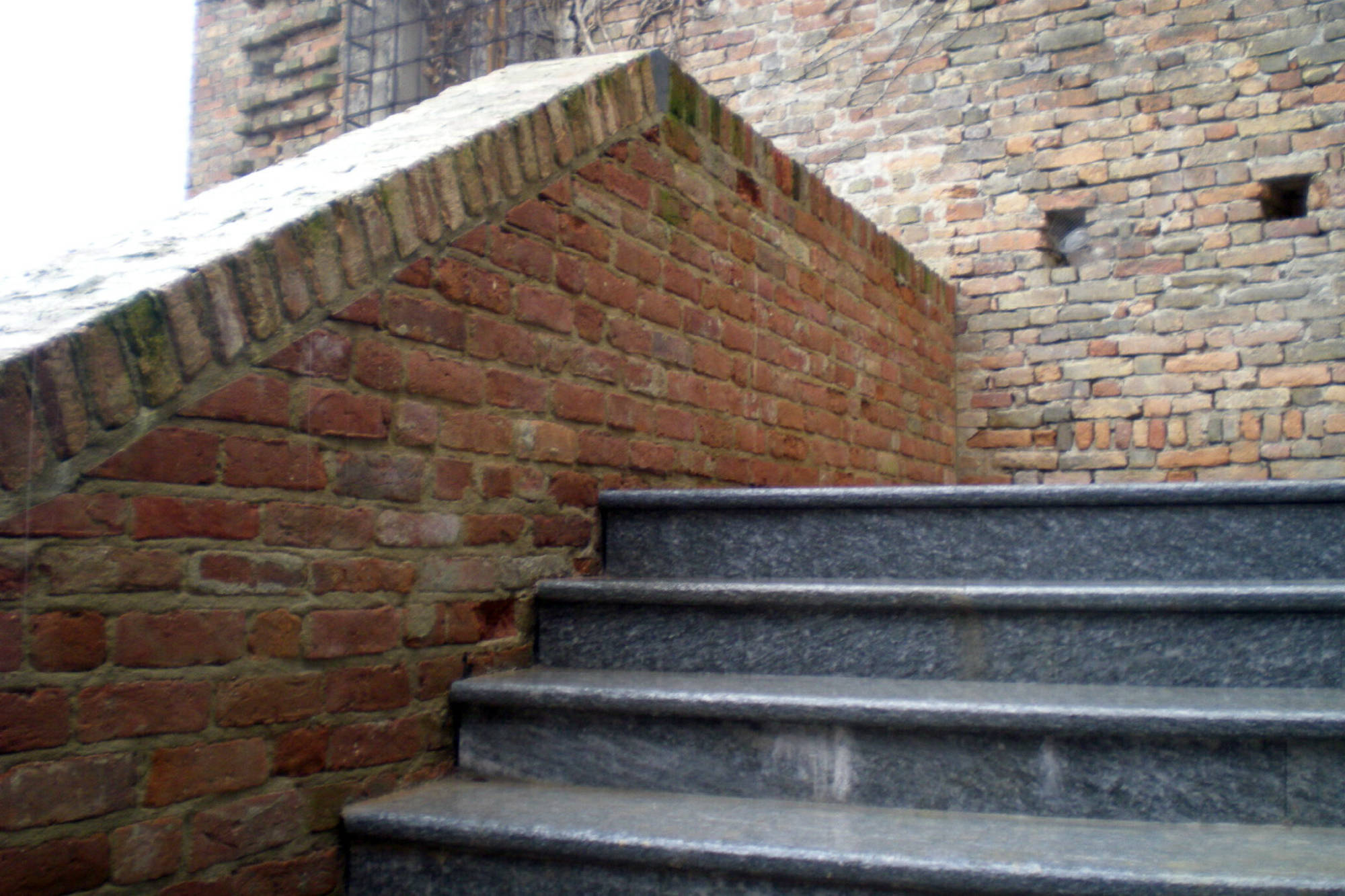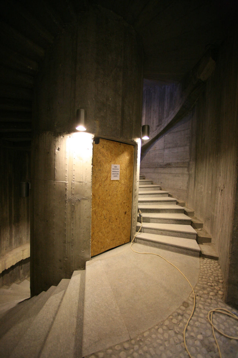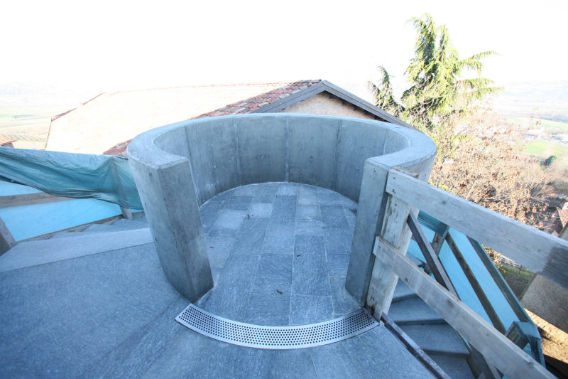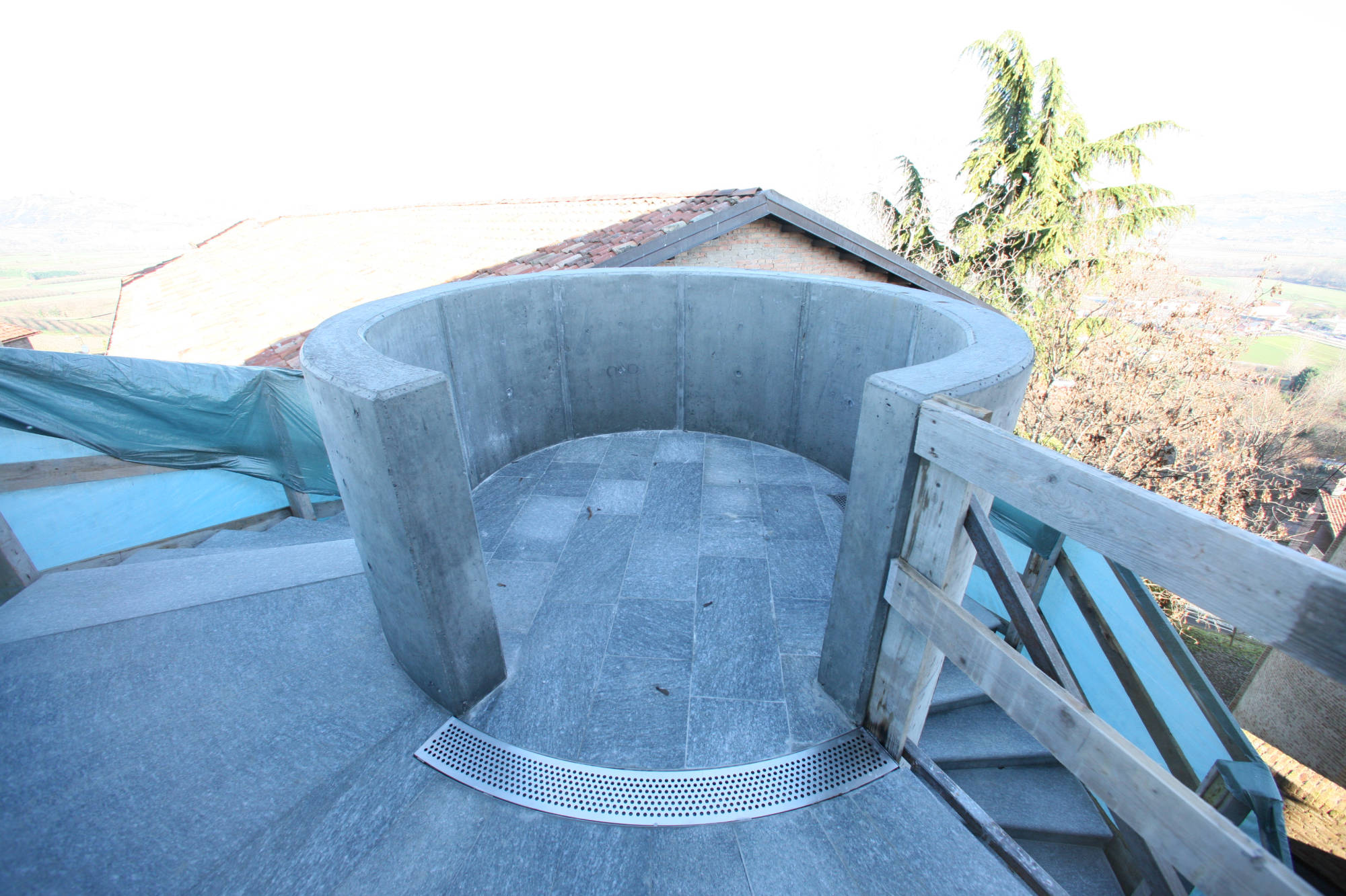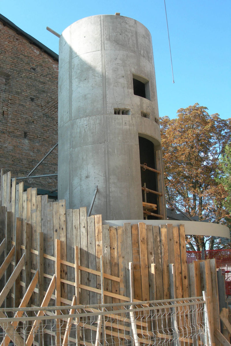 La costruzione del torrione dei collegamenti verticali, eseguita nella piccola area trapezoidale posta tra Castello e Pertinenza, ha comportato una delicata opera di scavo ed un’altrettanto attento rispetto delle quote da servire. Dovevano essere collegati Castello e Pertinenza con piani a quote diverse e si doveva scendere fino a raggiungere la quota della piazza del Municipio che si trova a circa nove metri sotto a quella del cortile del Castello. Il terreno era quasi completamente occupato dalla fondazione in cemento armato del serbatoio dell’acquedotto demolito in precedenza.