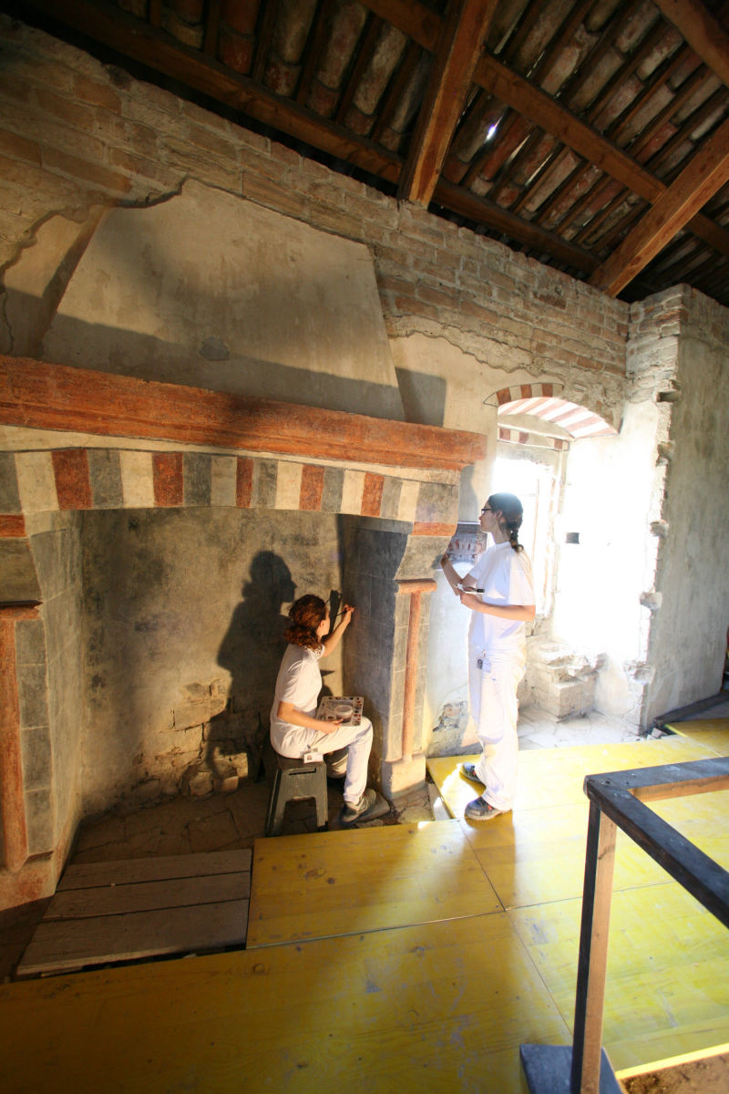 Nel primo lotto una campagna preventiva di sondaggi sulle murature interne ha portato a rilevare la presenza di decori medioevali a scacchiera su quasi tutti gli spigoli delle passate ed ha permesso di scoprire parti decorate di grande interesse quali i due cavalli neri della torre.